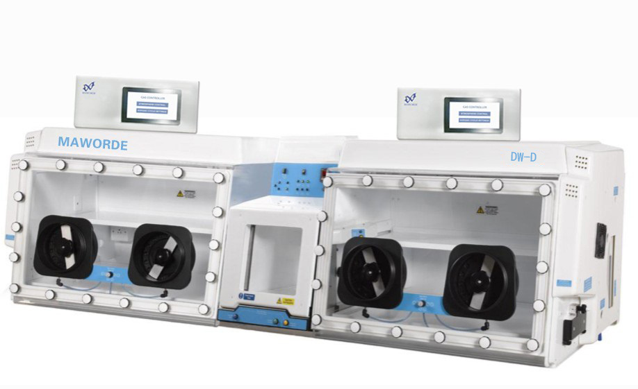 1.4 双室工作站,具有两个独立的工作室,可分别控制不同的气体环境,可单独使用也可同时使用,双室之间可通过转移匣互相转移样品,可大量节省气体。